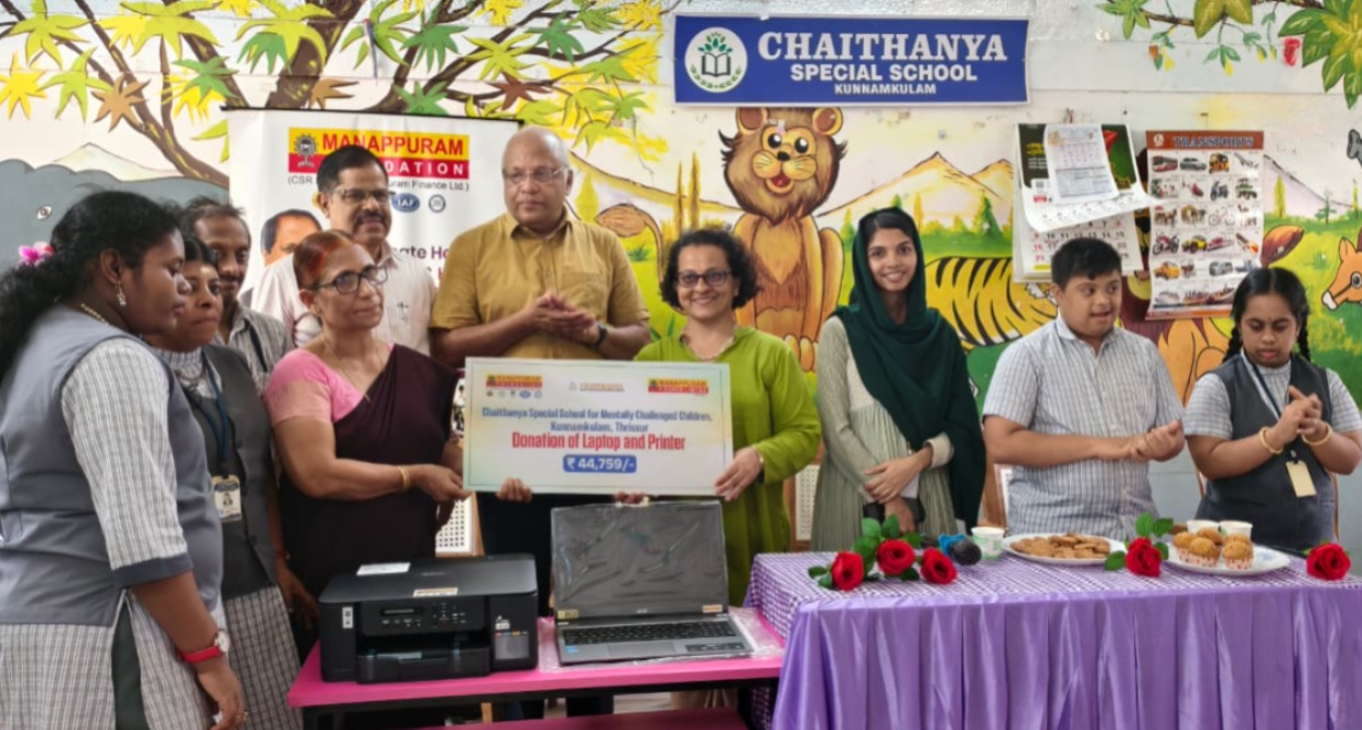 On 30th October 2025, Manappuram Foundation donated Laptop and Printer to Chaithanya Special School for Mentally Challenged Children, Kunnamkulam, Thrissur. The event was inaugurated by Ms. Lisy NJ, Principal of Chaitanya Special School, Mr. Ajith M Cheeran, President, Mr. Antony C I, Vice-president, Mr. Gilbert S Paramel, Secretary, Chaitanya Special School