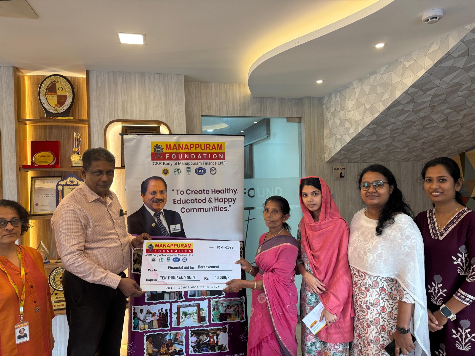 On 6th November 2025, Manappuram Foundation provided Financial Aid for Bereavement expenses to the family of Late. Aravinthakshan. The cheque was distributed by Mr. George De Das, CEO of Manappuram Foundation