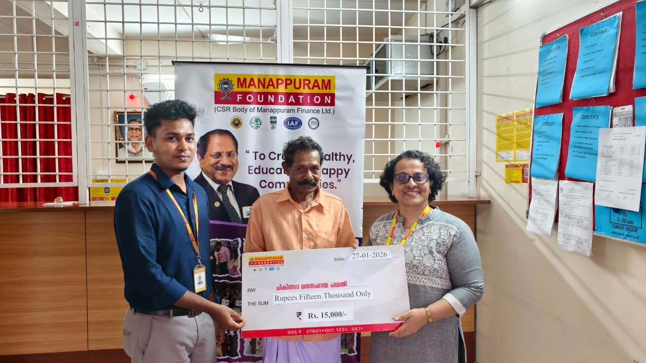 On 27th January 2026, Manappuram Foundation provided Medical Financial Assistance to 3 beneficiaries of Chalakudy in Thrissur District. The event was inaugurated by Ms. Silpa Tresa Sebastian, CSR Head, Manappuram Foundation